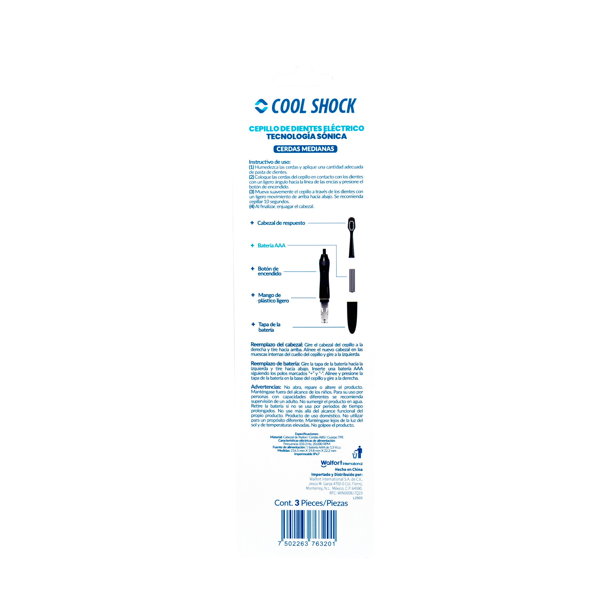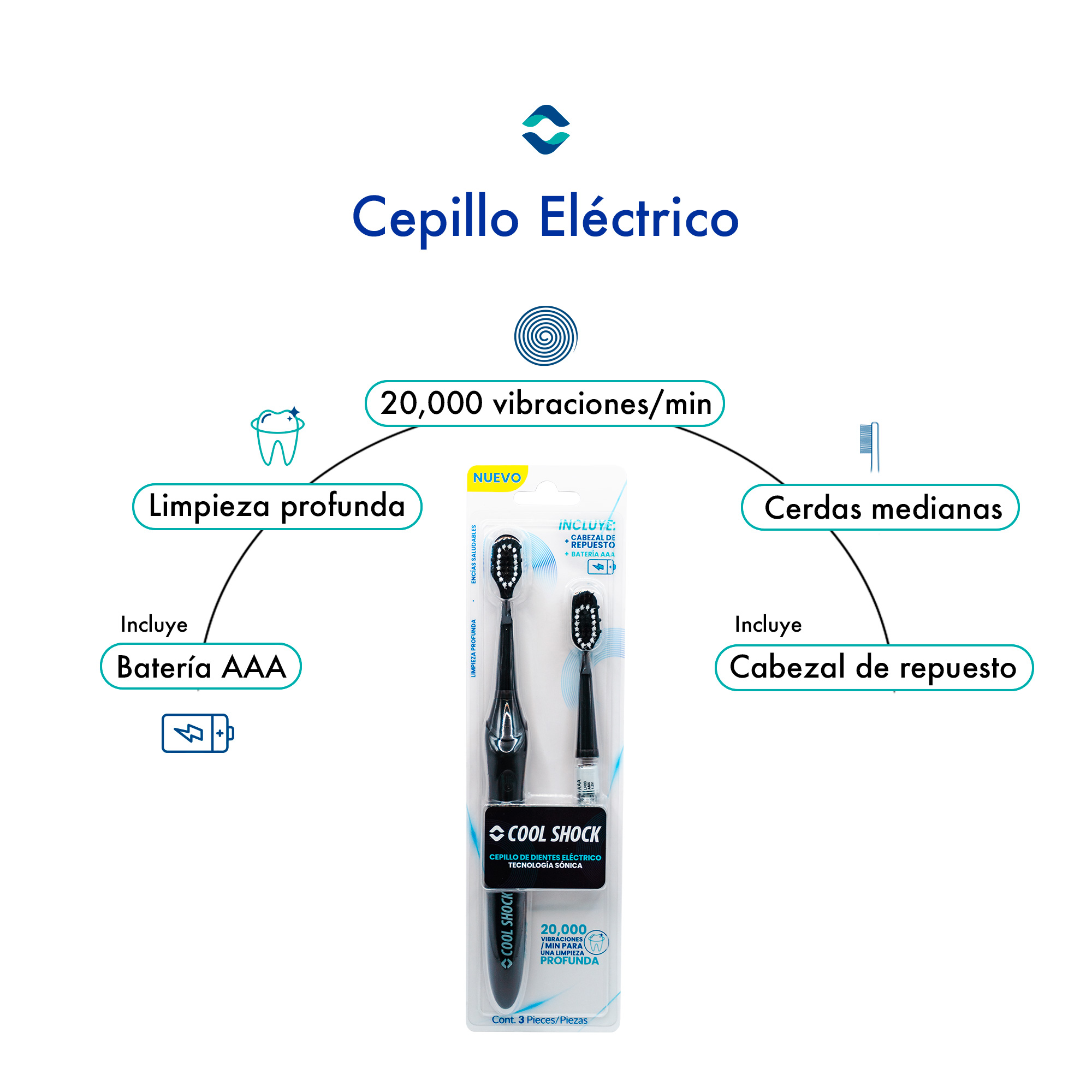 20,000 vibraciones por minuto, cepillo dental de cerdas medianas para una limpieza profunda. Incluye baterías AAA y cabezal de repuesto.