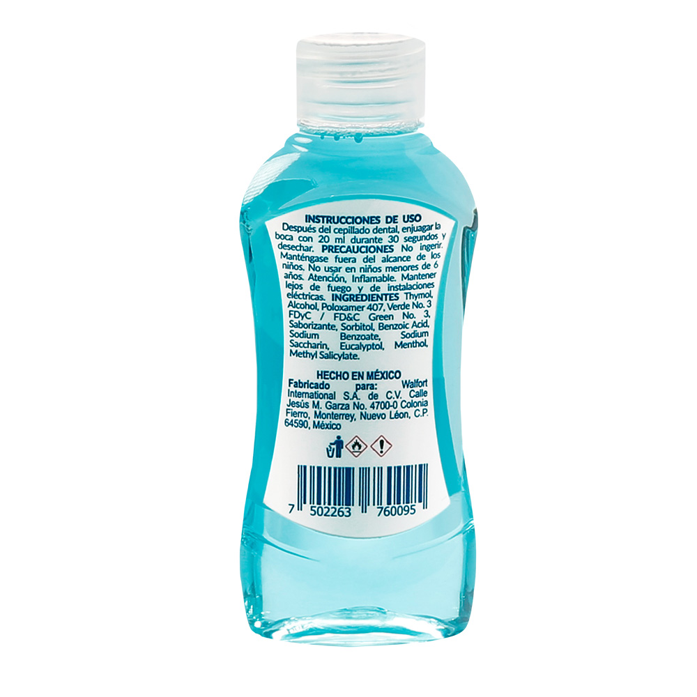 Enjuague bucal 50 ml. Contiene agentes antibacteriales que ayudan a eliminar gérmenes que causan el mal aliento, la placa dentobacteriana, caries y la gingivitis. Sabor menta, frescura al instante. Práctico tamaño para llevar a todos lados. INSTRUCCIONES: Después del cepillado dental, enjuagar la boca con 20 ml durante 30 segundos y desechar. PRECAUCIÓN: No ingerir. Mantengase al alcance de los niños. No usar en niños menores de 6 años. Atención, inflamable. Mantener lejos de fuego y de instalaciones eléctricas.