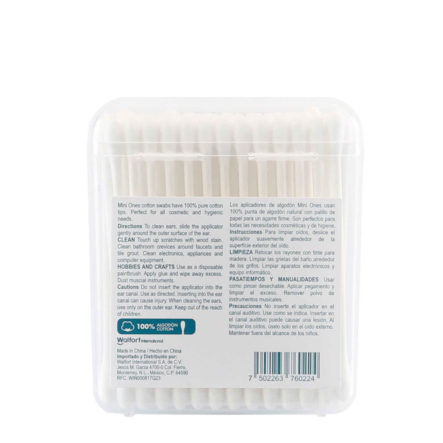 Hisopos de algodón 50 pz. Punta 100% de algodón. Palillo de papel para agarre firme. El estuche previene que los aplicadores se dispersen manteniéndolos ordenados y limpios. Perfectos para necesidades estéticas e higiénicas. INSTRUCCIONES Para limpiar oídos deslice el aplicador suavemente alrededor de la superficie exterior del oido. PRECAUCIONES No inserte el aplicador en el canal auditivo. Use como se indica. Insertar en el canal auditivo puede causar una lesión. Mantener fuera del alcancce de los niños.