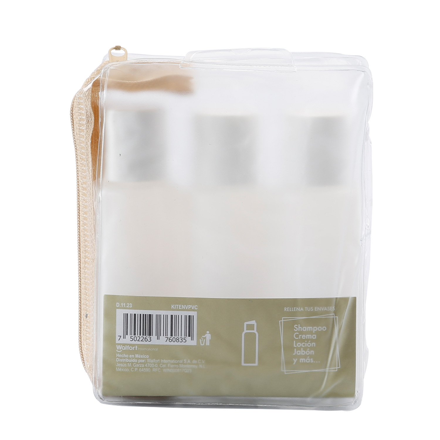 Kit de envases para viaje 60 ml 3 piezas. Contiene 3 botellas de plástico de 60 ml cada una, gracias a su práctico tamaño es ideal para transportar tus productos favoritos a donde vayas, el tamaño es el requerido en aereopuerto lo que lo hace perfecto para viajes. Incluye bolsa transportadora.