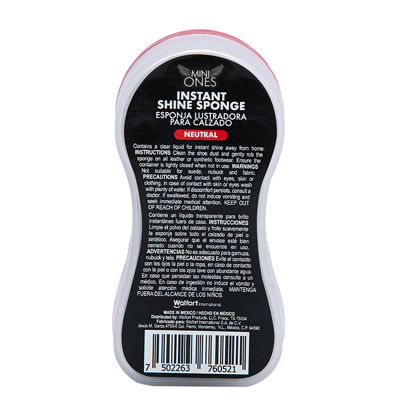 Lustrador de Calzado Neutro 1 pieza. Limpia y abrillanta calzado de piel y vinil, tamaño ideal para tu bolsillo. Contiene un líquido transparente para brillo instantáneo fuera de casa. INSTRUCCIONES Limpie el polvo del calzado, frote suavemente la esponja en todo el calzado de piel o sintético, después de uso tape firmemente y guarde. PRECAUCIONES No es adecuado para gamuza, nubuck y fibras. Mantenga fuera del alcance de los niños.