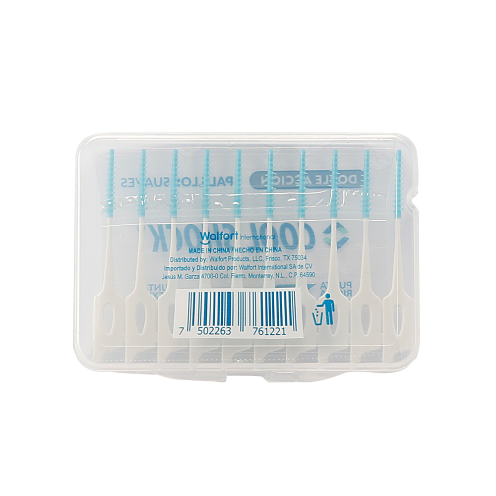 Palillo interdental suave 10 piezas. Las puntas flexibles de goma ayudan a eliminar eficazmente los alimentos y la placa, masajear las encías y retirar los restos de comida. Práctico empaque que permite llevarlos a todos lados INSTRUCCIONES DE USO: Retire un palillo y mueva suavemente entre los dientes para eliminar el material causante de caries y estimular las encías. Deseche después de su uso. Los dentistas recomiendan la limpieza interdental diaria. PRECAUCIONES: Nunca fuerce el cepillo en espacios reducidos. No use alrededor de áreas con rellenos excesivos o implantes dentales. No usar en niños menores a 6 años de edad.
