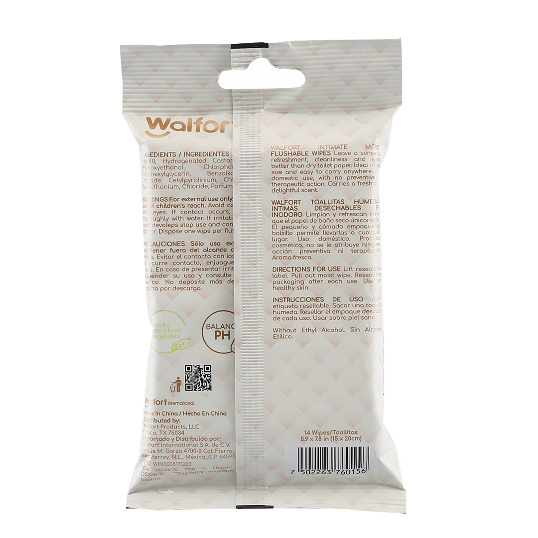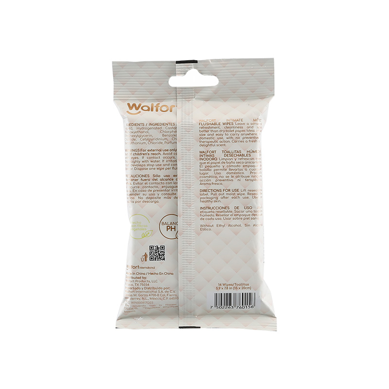 Toallitas húmedas íntimas desechables en el inodoro 14 piezas. Biodegradables, hechas con fibras vegetaes, sin alcohol. INSTRUCCIONES: Abrir la etiqueta resellable. Sacar una toallita húmeda. Resellar el empaque después de cada uso. Usar sobre piel sana. PRECAUCIONES: Sólo uso externo, mantener fuera del alcance de los niños. Evitar el contacto con los ojos. Si ocurre contacto, enjuague con agua. En caso de irritación suspender su uso y consulte a un médico. No depostite más de una toallita por descarga.
